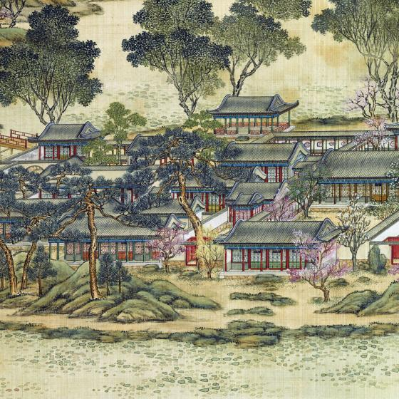 另一条重要信息见于乾隆元年十一月十五日如意馆档案含附记:“沈源来说,太监毛团传旨:着唐岱、郎世宁、沈源画圆明园一副。钦此。(于乾隆三年五月十一日唐岱将画得圆明园一副持进,贴在清晖阁讫。)”该画即《日下旧闻考》卷八十所载之《圆明园全图》:“清晖阁北壁悬《圆明园全图》,乾隆二年命画院郎世宁、唐岱、孙祐(祜)、沈源、张万邦、丁观鹏恭绘,御题‘大观’二字,并题联曰:‘稽古重图书,义存无逸三宗训;勤民咨稼穑,事著豳风七月篇’。”两者参看,实际下旨是在元年十一月,最初仅指派唐、郎、沈三人绘制,后又增加三人。