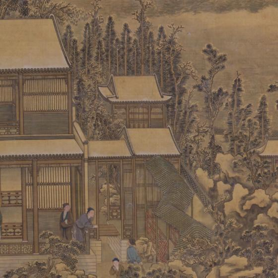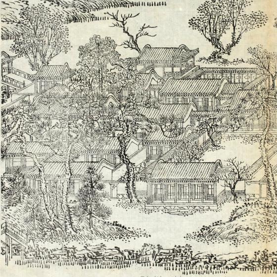 那么011-0001图中这几座建筑又是分别对应四景中的哪一个呢?小香幢在长春园狮子林是一座歇山小楼,故宫博物院藏《乾隆古装雪景行乐图》将其画成三开间(图8),而据国家图书馆藏样式雷“横碧轩至探真书屋间地盘全样”(073-0002)(图9),其面阔实为一间,因此判断清晖阁西南隅这个所谓的“小香幢”就是松云楼,与之相邻的“套殿”起门厅作用。其余三景由西向东依次为露香斋、涵徳书屋、茹古堂。乾隆三十年六月首题清晖阁四景,其中《涵徳书屋》诗中有“书屋刚容方丈宽”之句,恰与图中小“敞厅”相合,可佐证上述判断。建筑形制不好断言,但也不妨做一推测:松云楼应是与狮子林小香幢一样的歇山小楼,套殿为硬山耳房,露香斋为三间硬山,涵徳书屋为单间攒尖或悬山,茹古堂为三间歇山。