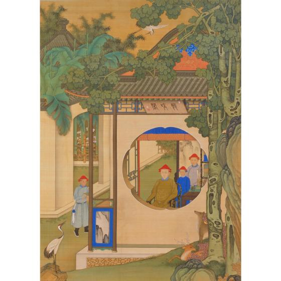 清晖阁从单层变两层的时间,王志伟认为在“乾隆二十八年不戒于火后,乾隆三十年恢复,并增饰为二层”,此说有待商榷。《弘历行乐图》绘制时间,据乾隆二十八年八月初八日如意馆档案:“接得员外郎安泰、李文照押帖一件,内开:七月二十六日懋勤殿交宣纸一张,怡情书史东次间东墙板披一张,着如意馆(照)原画过池上居诗意,传旨:着交如意馆画。”虽未指定由何人来画,但可以肯定正是张廷彦所绘这一张,作画时间应在二十八年内,距当年端午节失火只有数月之隔。画中阁岿然在望,仅上方大片空白处未见九松而已。从构图看,九州清晏殿仅露出一角,弘历所在位置过于偏向左侧,取景显然特意避开了被焚的奉三无私殿及其西侧库房、西佛堂等,但画面中由左至右出现的九州清晏殿、殿西两进库房、乐安和、怡情书史、清晖阁、韵玉轩、鸢飞鱼跃均得以幸存。另据乾隆二十八年六月初六日如意馆:“接得员外郎安泰、李文照押帖一件,内开:五月十七日太监如意传旨:《圆明园全图》着如意馆换裱,找补颜色。”此时火灾刚过不久,藏于阁内的《圆明园全图》恐遭烟熏有所污损,需要修补重裱,而阁本身应无大恙。这里有必要顺带一提的是,两层楼阁时期的《圆明园全图》已由贴落改为挂轴,挂于首层后照壁即后金柱屏门上,故成书于乾隆四十七年的《日下旧闻考》称“清晖阁北壁悬《圆明园全图》”,用的是“悬”字而非“贴”字。此画曾经重贴、重裱,变更不止一次。